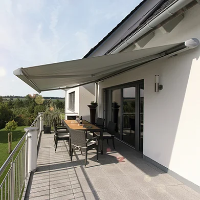 - Schutz von oben für Tuch und Gelenkarme durch das serienmäßige Regendach